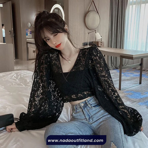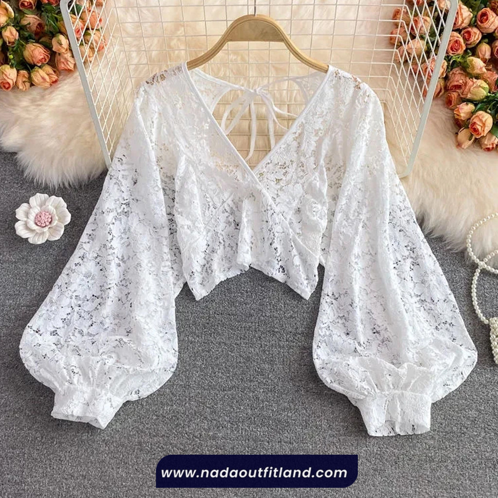 Buy Batwing Sleeve Backless Cropped Lace Blouse Shirt from Nada Outfit Land for your outfit of the day. This item is in stock and ready to order. World Wide Shipping Service. Check our Shop for more trendy fashion.