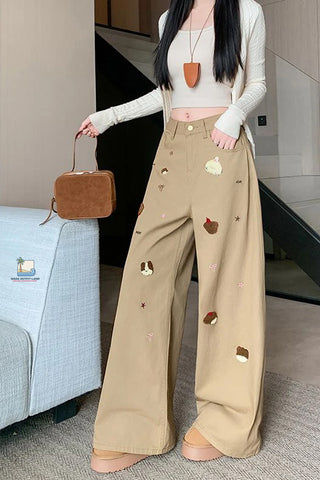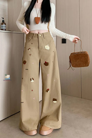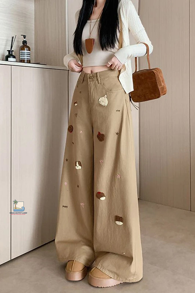 The High Waist Loose Cute Dog Embroidered Khaki Jeans Pants pair beautifully with sneakers, boots, casual jackets, or graphic tees, making them ideal for casual outings, travel, campus fashion, or relaxed weekend looks.