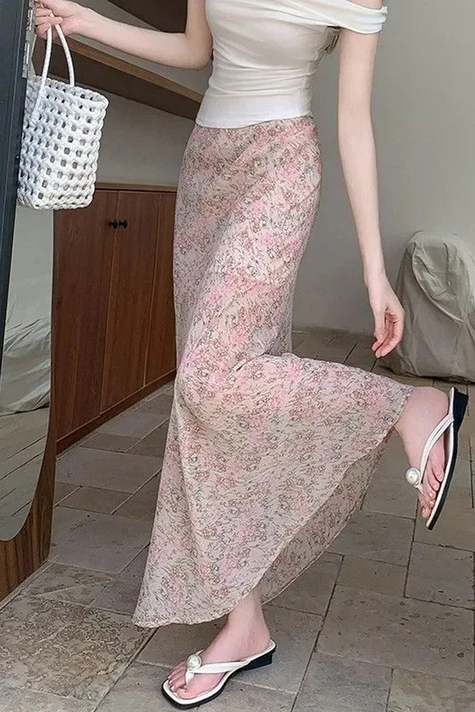 Crafted from a lightweight, fluid fabric, this maxi skirt offers a high-waist fit that elongates the legs and cinches the midsection for a classic hourglass look. The intricate floral print is designed to be timeless, featuring shades of blush, rose, and peony that pop against a soft background. Whether you are walking through a botanical garden or attending a sunset beach wedding, the flared mermaid hem ensures every movement is graceful. Pair it with a simple white bodysuit for a clean, modern look, or a matching lace crop top to fully embrace the romantic aesthetic.