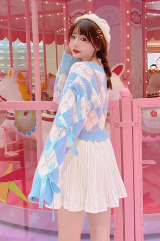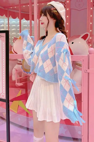 Master the art of "New Prep" with our Long Sleeve Blue Argyle Pattern Cropped Bow Sweater. This piece breathes fresh life into the classic heritage aesthetic, blending the structured tradition of the argyle diamond knit with the playful, feminine charm of a delicate bow accent. The soft blue color palette offers a calm, sophisticated vibe that fits perfectly into both Light Academia and "Soft Girl" capsule wardrobes.