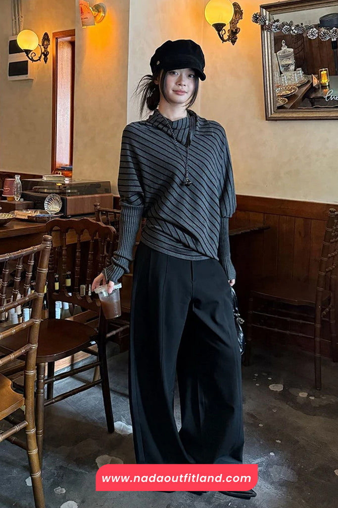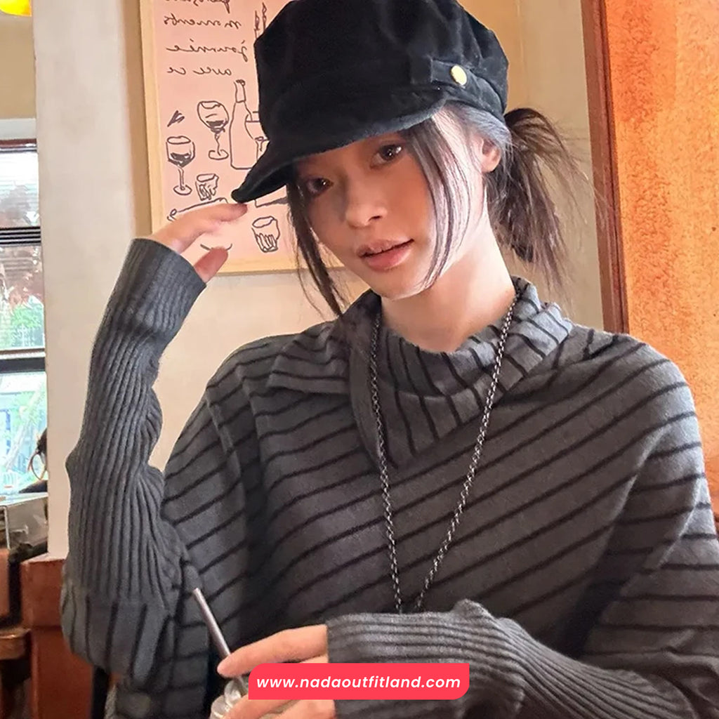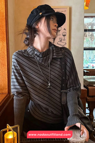 Buy Long Sleeve Irregular Collar Grey Striped Sweater from Nada Outfit Land for your outfit of the day. This item is in stock and ready to order. World Wide Shipping Service. Check our Shop for more trendy fashion.
