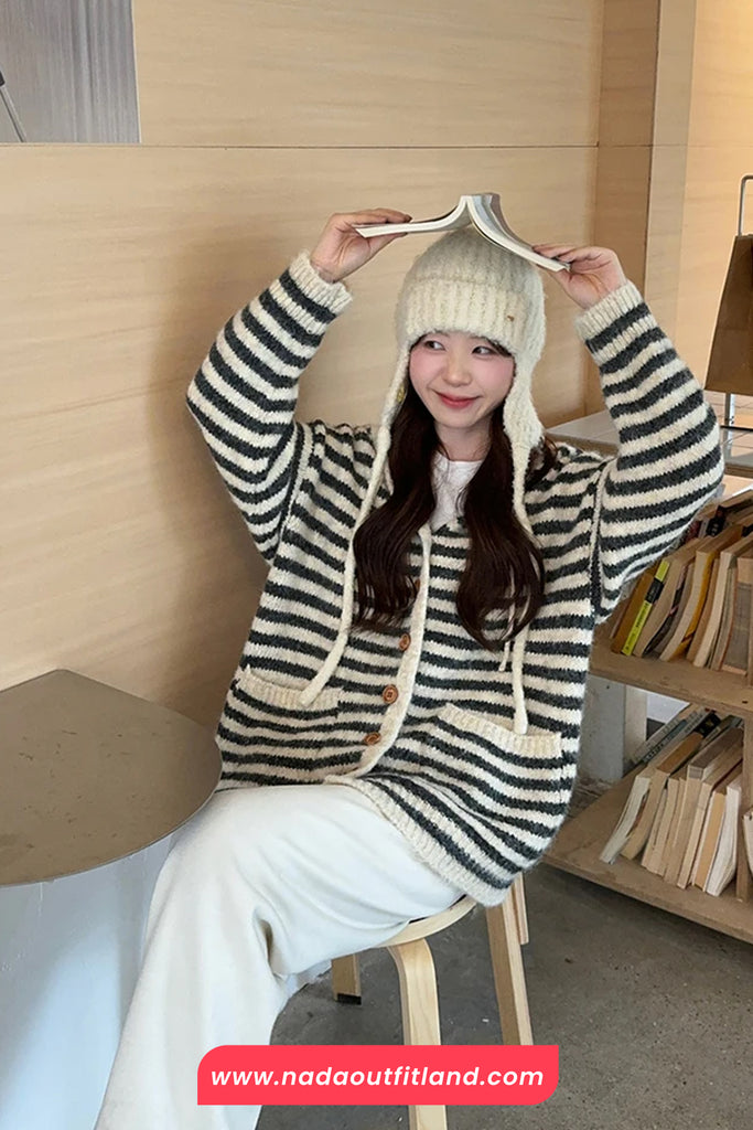 Buy Long Sleeve Knitted Striped Hooded Cardigan Sweater from Nada Outfit Land for your outfit of the day. This item is in stock and ready to order. World Wide Shipping Service. Check our Shop for more trendy fashion.