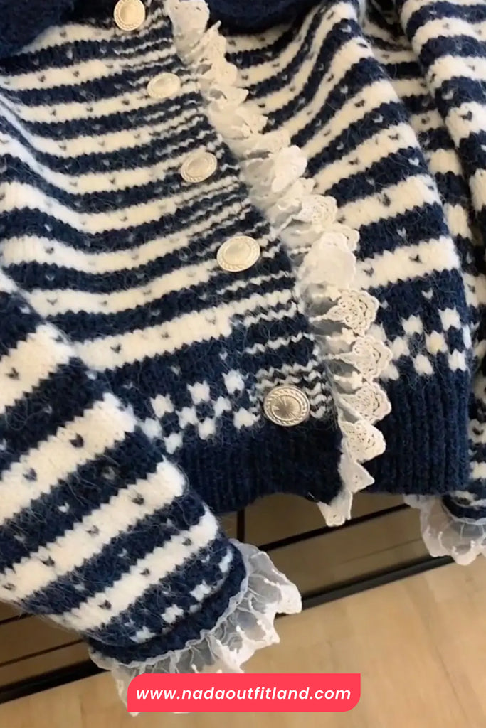 Buy Long Sleeve Lapel Collar Lace Patchwork Striped Cardigan Sweater from Nada Outfit Land for your outfit of the day. This item is in stock and ready to order. World Wide Shipping Service. Check our Shop for more trendy fashion.