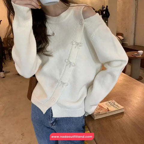 Buy Long Sleeve Off Shoulder Bow Pins Sweater from Nada Outfit Land for your outfit of the day. This item is in stock and ready to order. World Wide Shipping Service. Check our Shop for more trendy fashion.