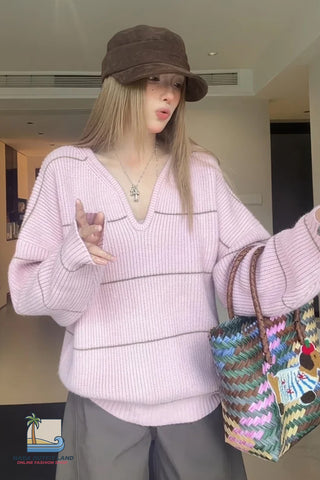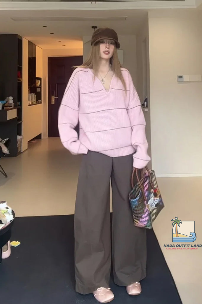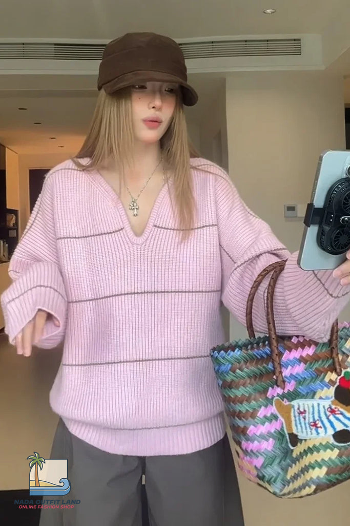 Buy Long Sleeve Sexy V-Neck Striped Pink Knitted Sweater from Nada Outfit Land for your outfit of the day. This item is in stock and ready to order. World Wide Shipping Service. Check our Shop for more trendy fashion.
