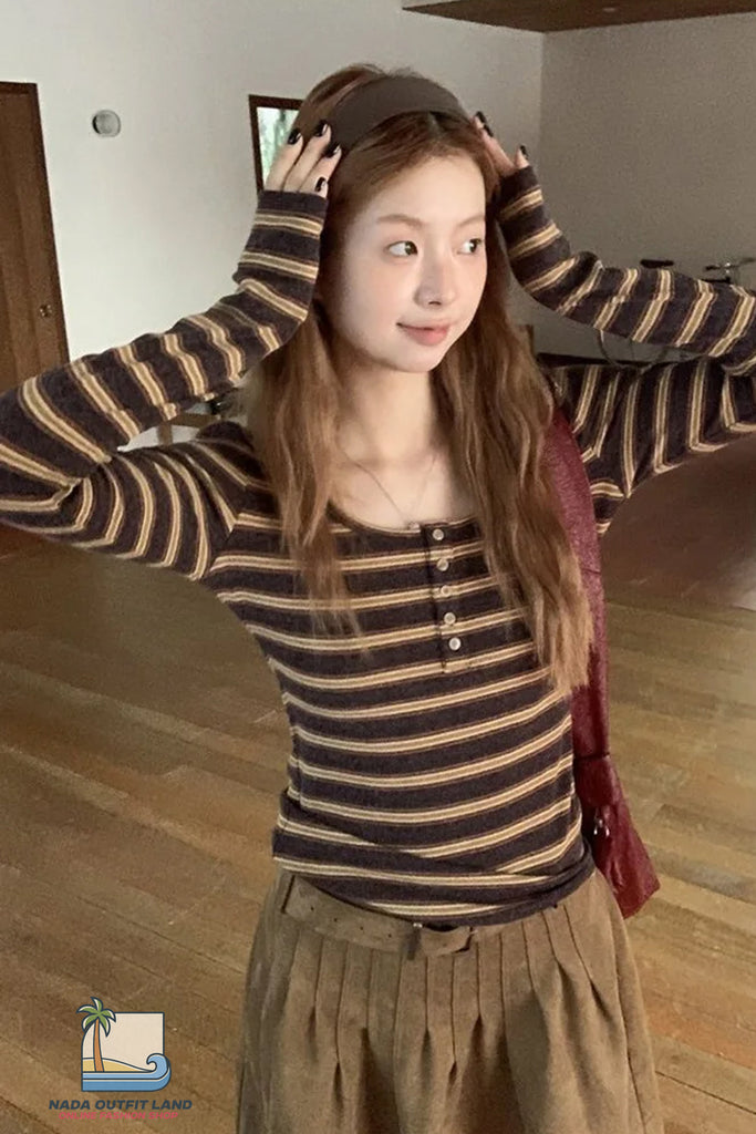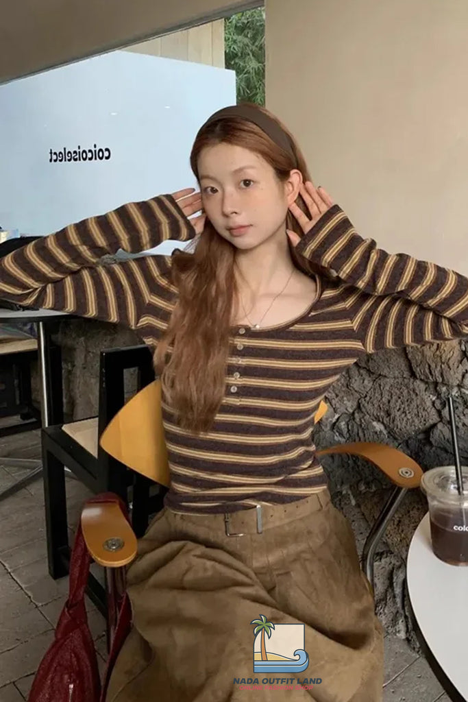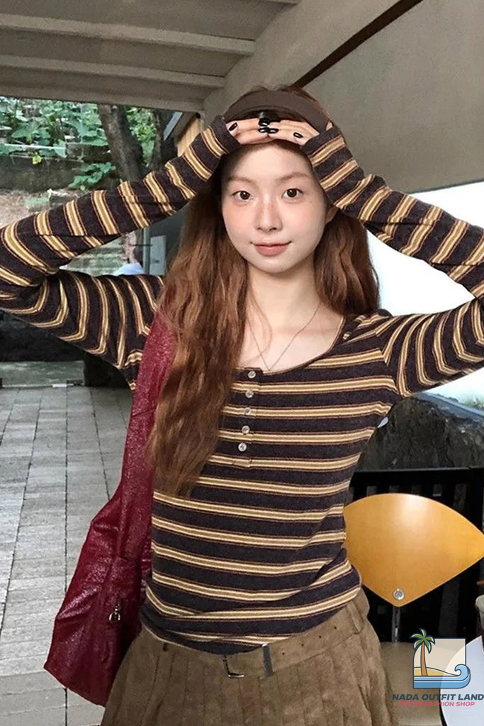 Buy Long Sleeve U-Neck Retro Striped Shirt from Nada Outfit Land for your outfit of the day. This item is in stock and ready to order. World Wide Shipping Service. Check our Shop for more trendy fashion.