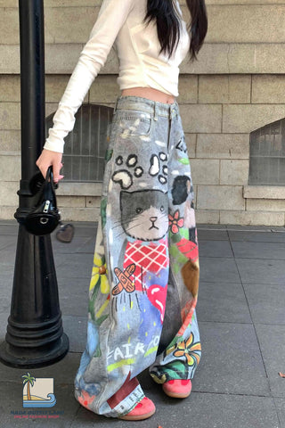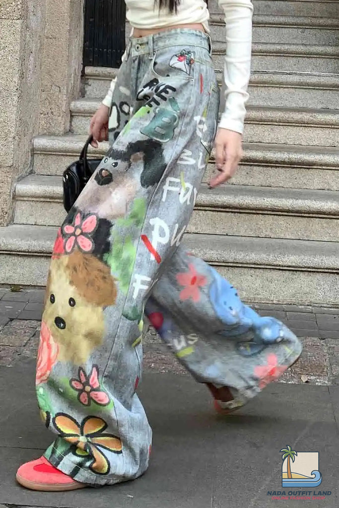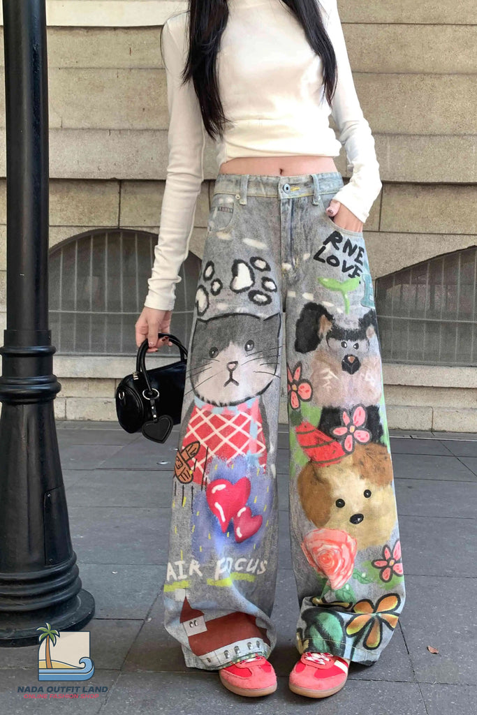 Buy Loose Cute Doodle Animal Printed Jeans Pants from Nada Outfit Land for your outfit of the day. This item is in stock and ready to order. World Wide Shipping Service. Check our Shop for more trendy fashion.