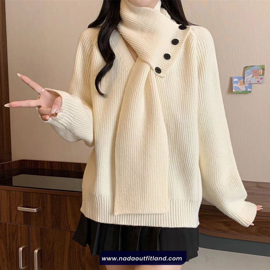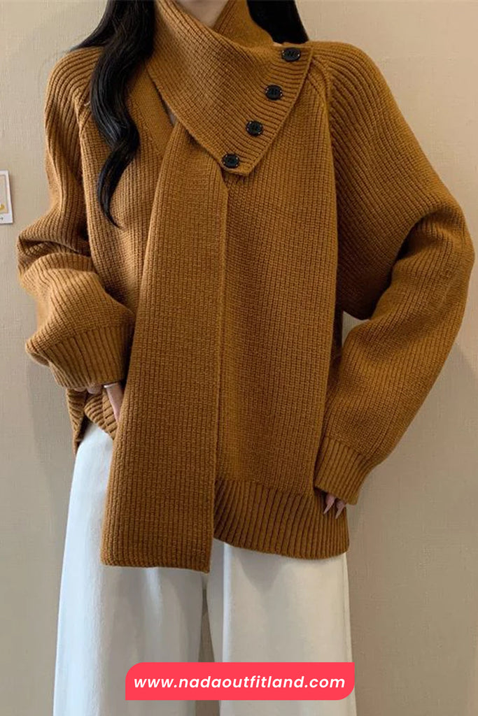 Buy Loose Removable Scarf Knitted Sweater from Nada Outfit Land for your outfit of the day. This item is in stock and ready to order. World Wide Shipping Service. Check our Shop for more trendy fashion.