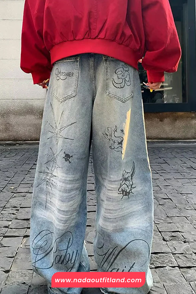 Buy Loose Retro Printed Wide Leg Jeans Pants from Nada Outfit Land for your outfit of the day. This item is in stock and ready to order. World Wide Shipping Service. Check our Shop for more trendy fashion.