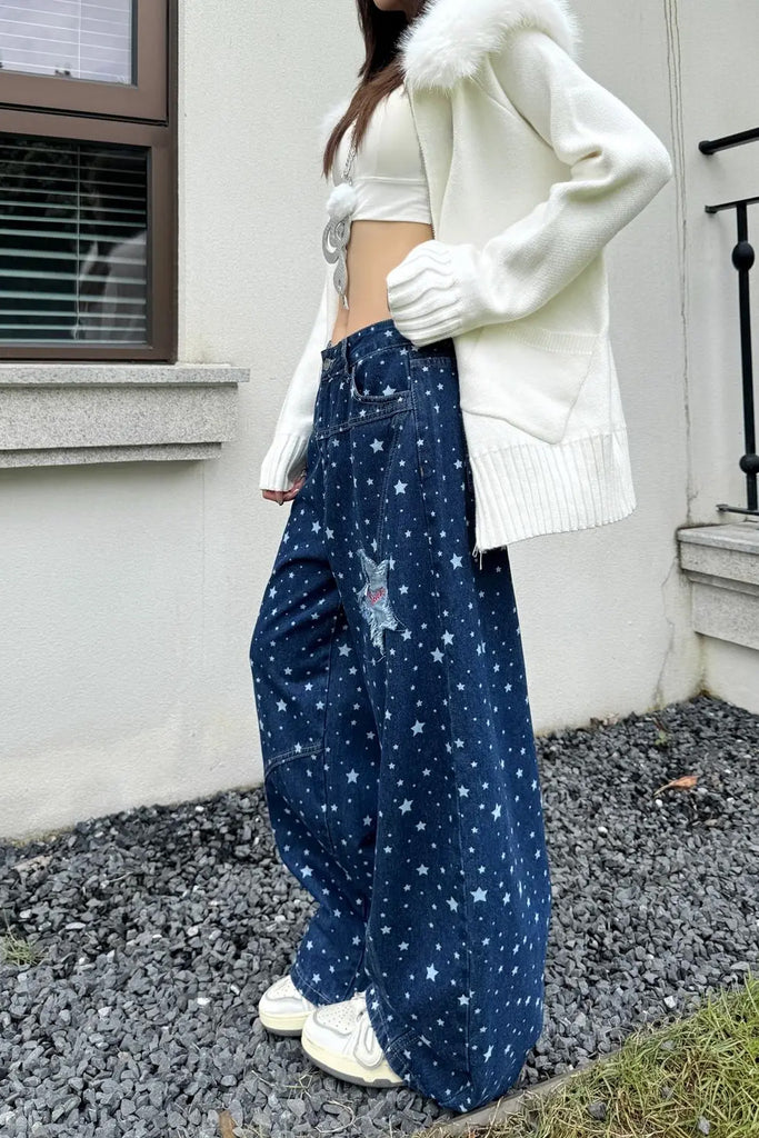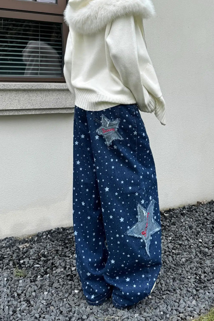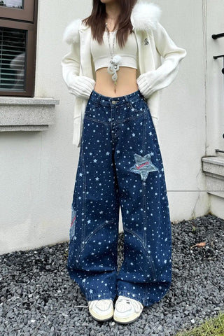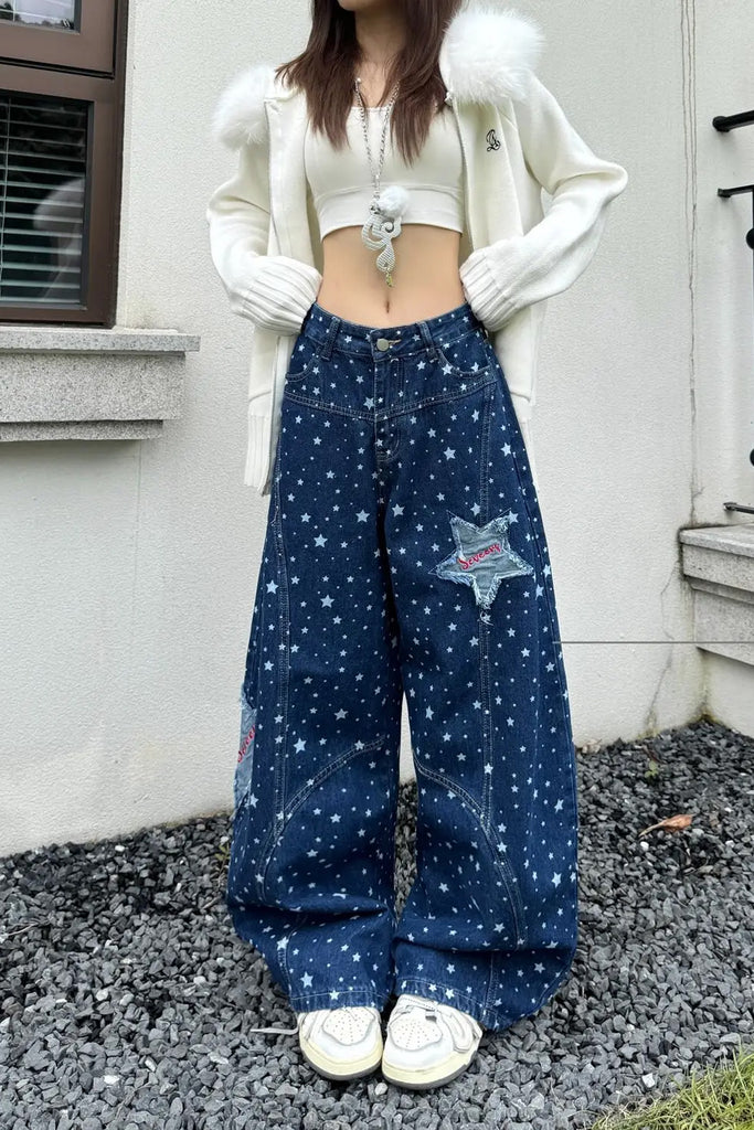 Step into the spotlight with our Loose Retro Stars Pattern Patchwork Washed Blue Jeans, the ultimate statement piece for your streetwear rotation. These aren't just jeans; they are a tribute to the bold, experimental style of the early 2000s and Y2K era. Featuring eye-catching star patchwork detailing and a vintage-inspired "washed blue" finish, these pants capture that sought-after "lived-in" aesthetic while remaining undeniably modern.