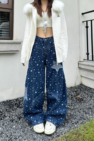 Crafted from heavy-duty, high-quality denim, these pants are engineered for the iconic baggy, wide-leg fit that defines modern street style. The intricate star appliqué work adds a tactile, multi-dimensional texture that sets you apart from the sea of basic denim. Designed with a relaxed rise and an inclusive silhouette, they offer maximum comfort and movement, making them perfect for skating, hanging out, or creating content. Whether you're aiming for a Cyber-Core vibe with a metallic crop top or a classic 90s Grunge look with an oversized hoodie, these star-patchwork jeans provide the perfect canvas for self-expression.