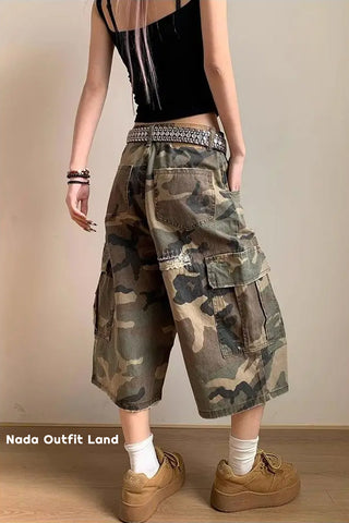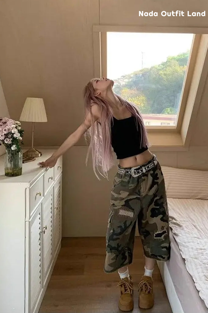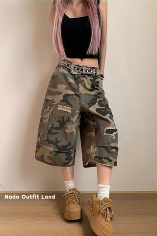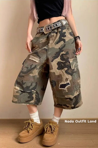 Buy Loose Ripped Patched Knee Length Camouflage Pants from Nada Outfit Land for your outfit of the day. This item is in stock and ready to order. World Wide Shipping Service. Check our Shop for more trendy fashion.