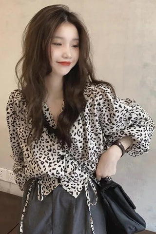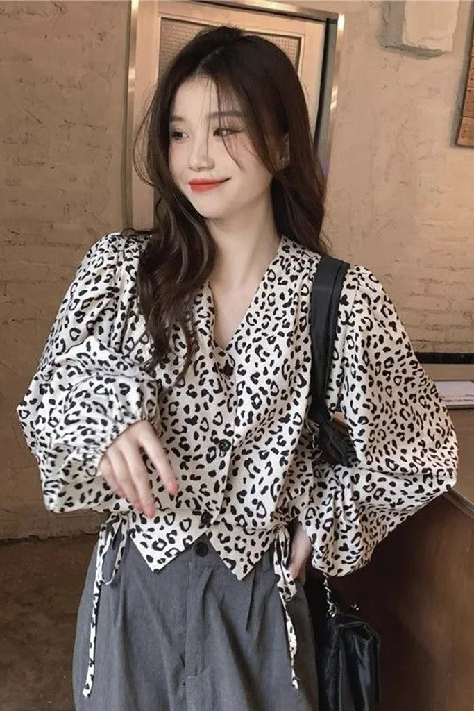 Unleash your wild side with our V-Neck Leopard Pattern Lace Up Slim Blouse Shirt. This top is the ultimate fusion of classic animal print and contemporary edge. Featuring a daring lace-up grommet detail at the neckline, this blouse allows you to customize your look—wear it tightened for a sharp, sophisticated V-neck or loosened for a more relaxed, sultry aesthetic. The "slim fit" tailoring is designed to hug your curves, making it the perfect "going-out" top for those who want to make a statement.