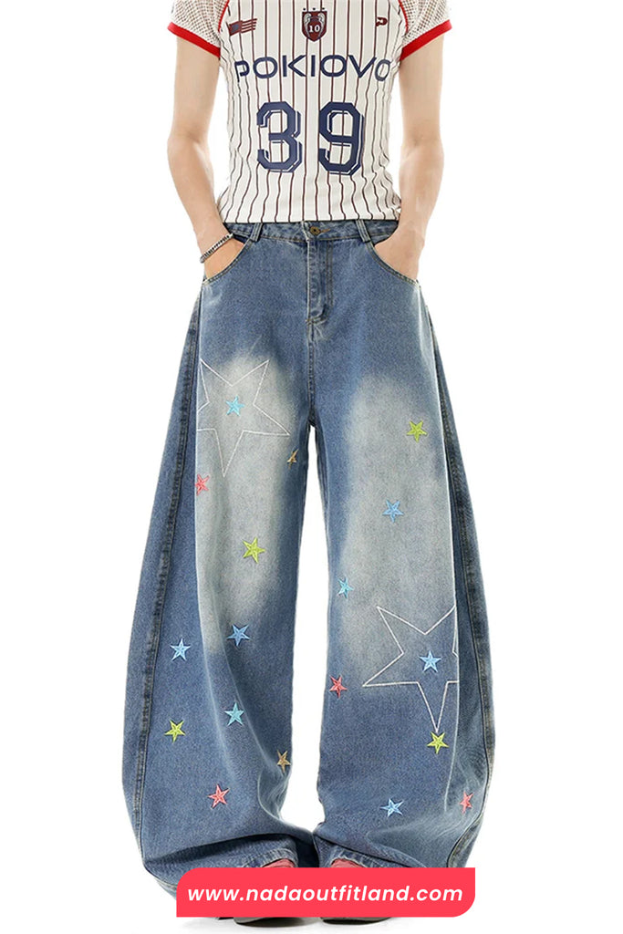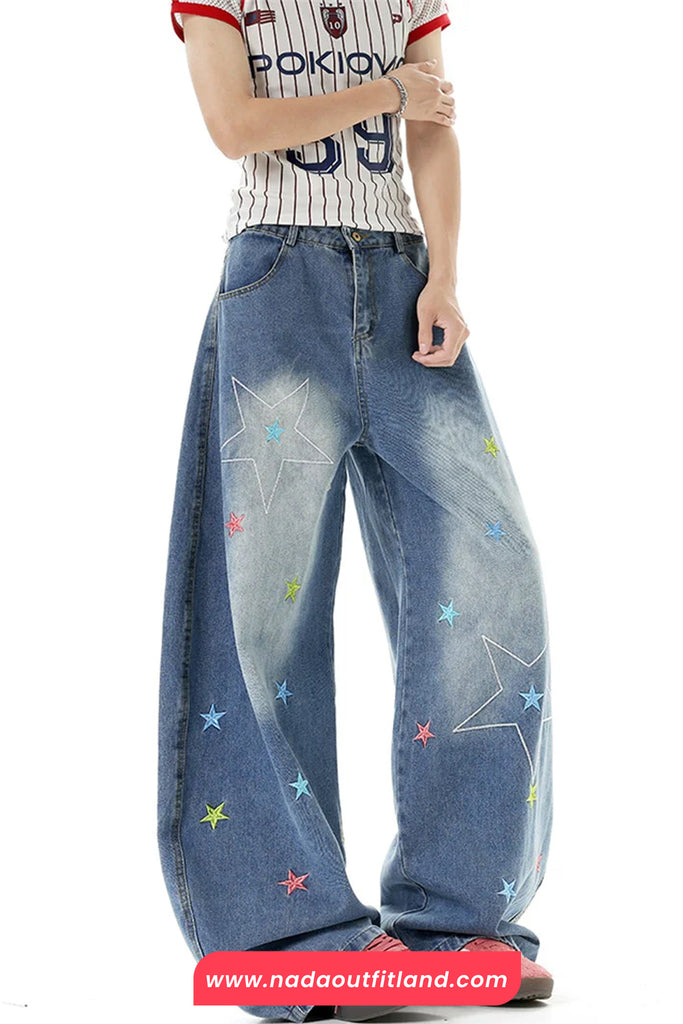 Buy Vintage Stars Pattern Embroidered Flare Jeans Pants from Nada Outfit Land for your outfit of the day. This item is in stock and ready to order. World Wide Shipping Service. Check our Shop for more trendy fashion.
